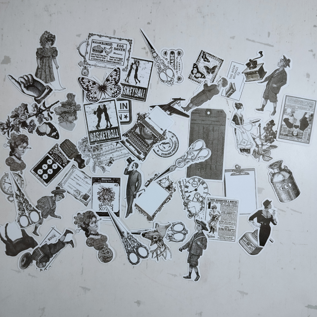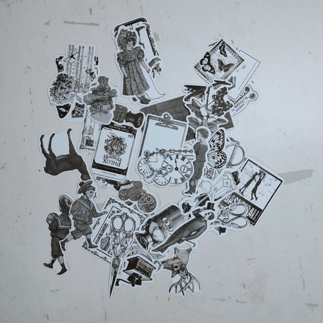 Introducing our sophisticated Black and White Elements Washi Sticker set, a versatile collection designed to add timeless elegance to your planner, notebook, or journal. With a generous offering of 50 unique designs, each meticulously crafted without repeat, this set brings together a captivating array of vintage-inspired elements. From classic scissors and ornate frames to nostalgic posters and charming figures, these stickers effortlessly infuse your pages with character and flair. Crafted from semi-transparent washi material, they seamlessly blend into the page, making them perfect for layering atop other media. Elevate your creative pursuits with this must-have set that promises endless possibilities for expression.
