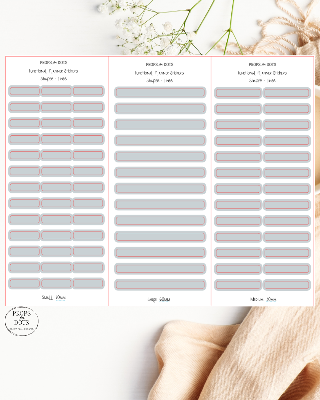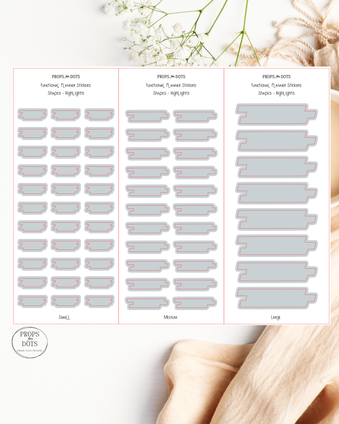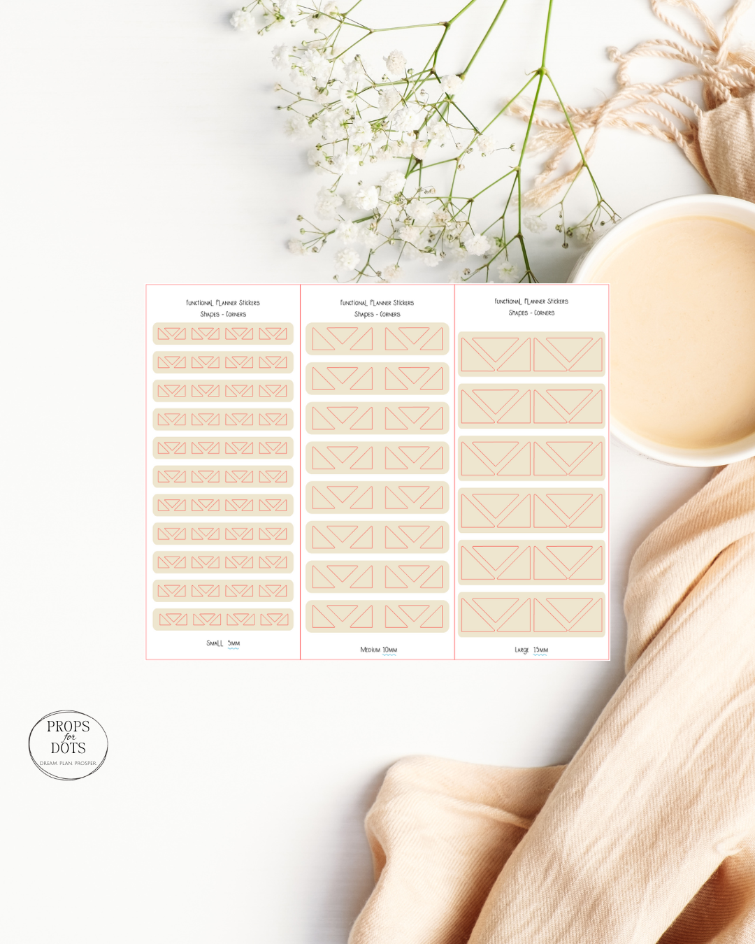 Each set includes 3 washi sticker sheets (7 × 17 cm each), featuring functional shapes in three different sizes. You’ll find options for dots, squares, corner triangles, lines, highlights, arrows, banners, and drop shapes — perfect for colour coding, marking important tasks, or adding subtle structure to your layouts.
