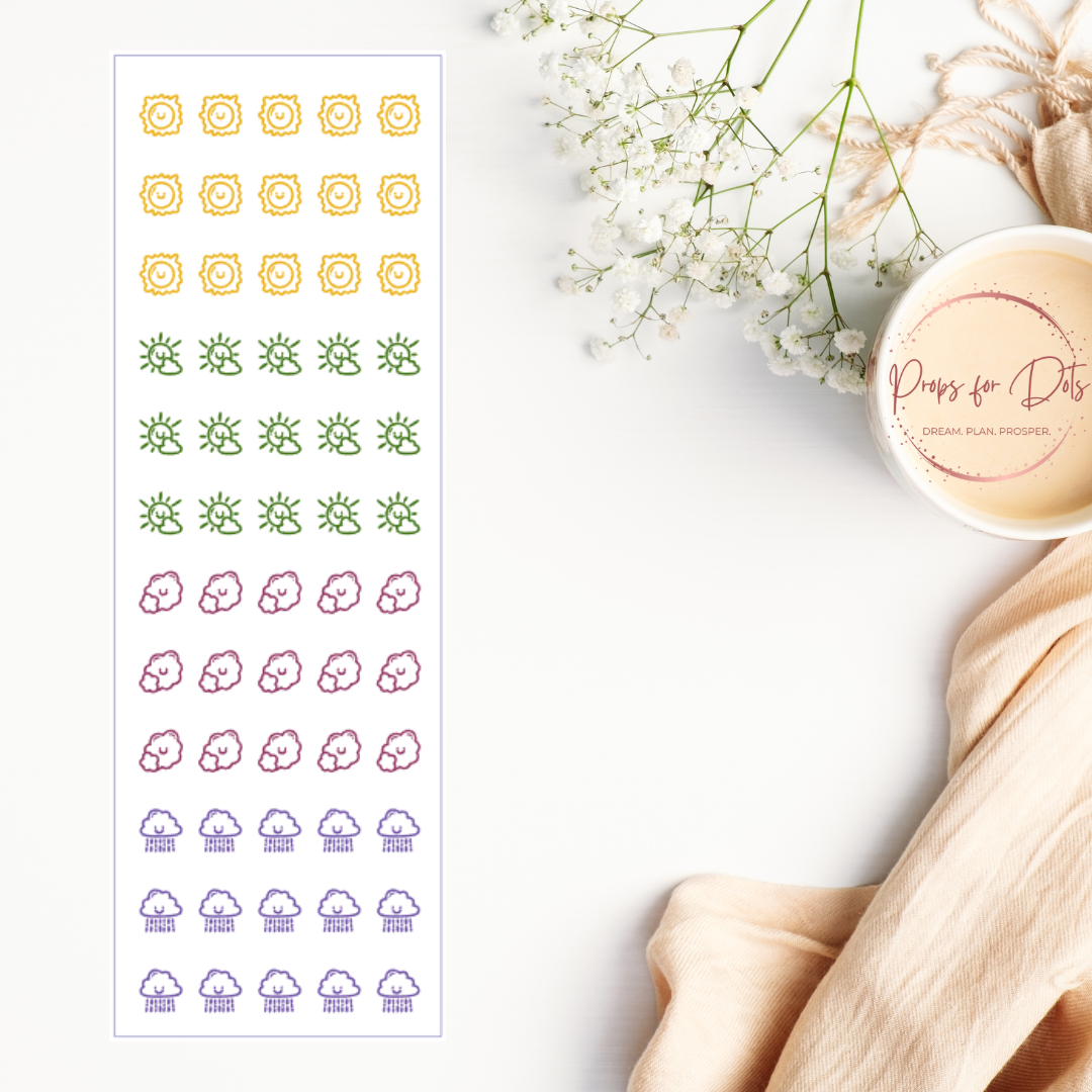 ✔ Optional Weather Icon Sheet – Track the forecast with sunny, cloudy, rainy, and partly cloudy stickers in coordinating theme colors.