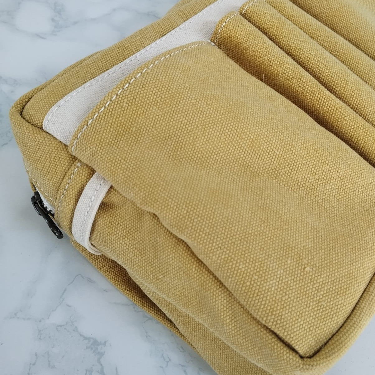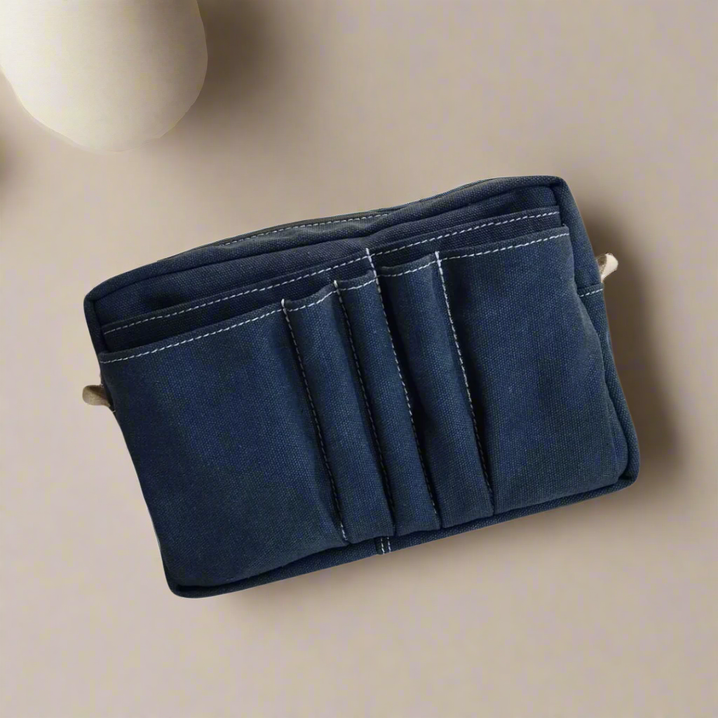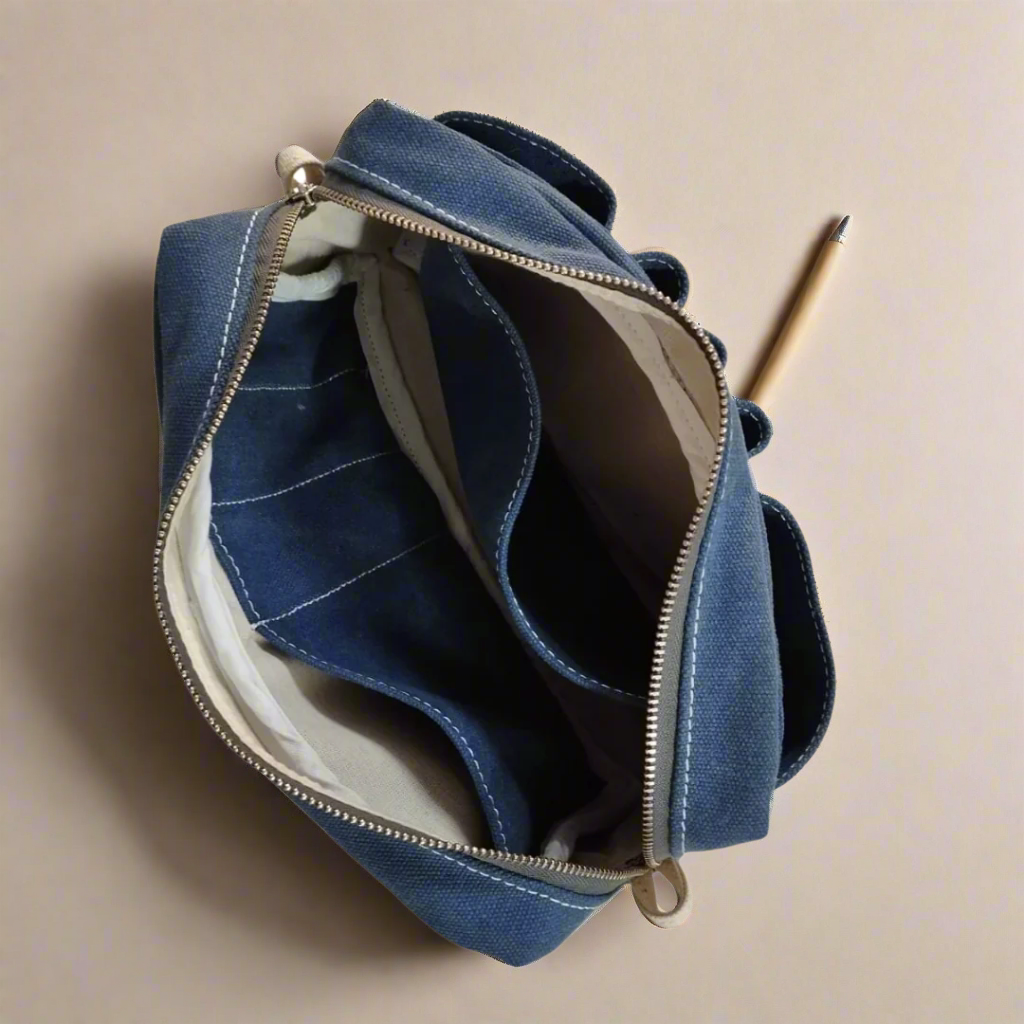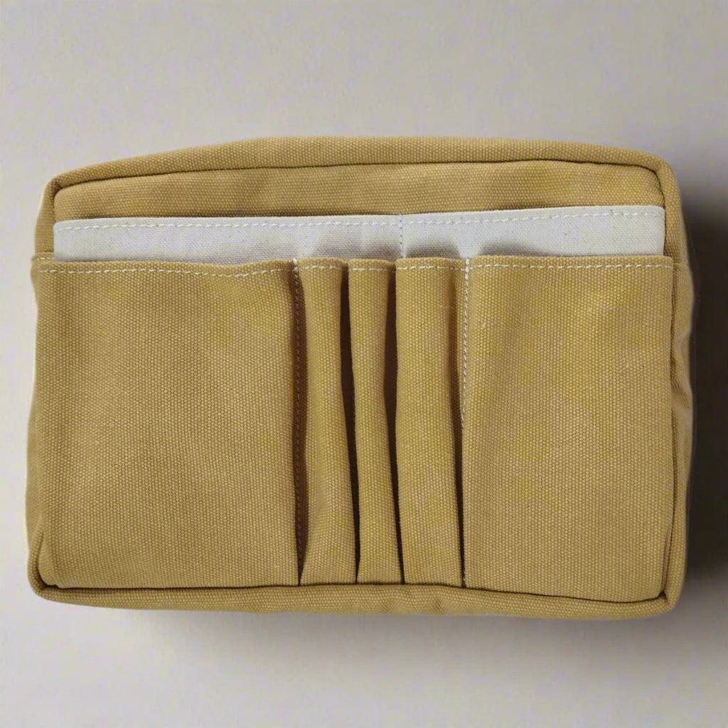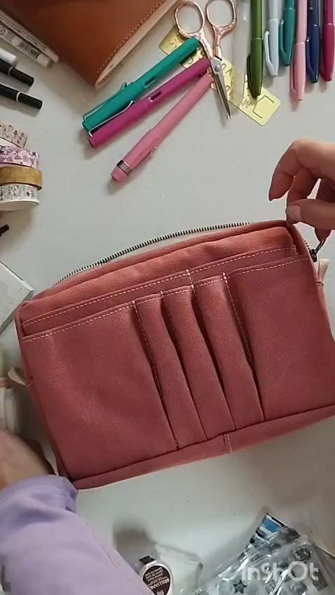 One full-width flat pocket topped with two additional box pleat pockets — ideal for quick-grab items like stickers, earbuds, or washi rolls. -