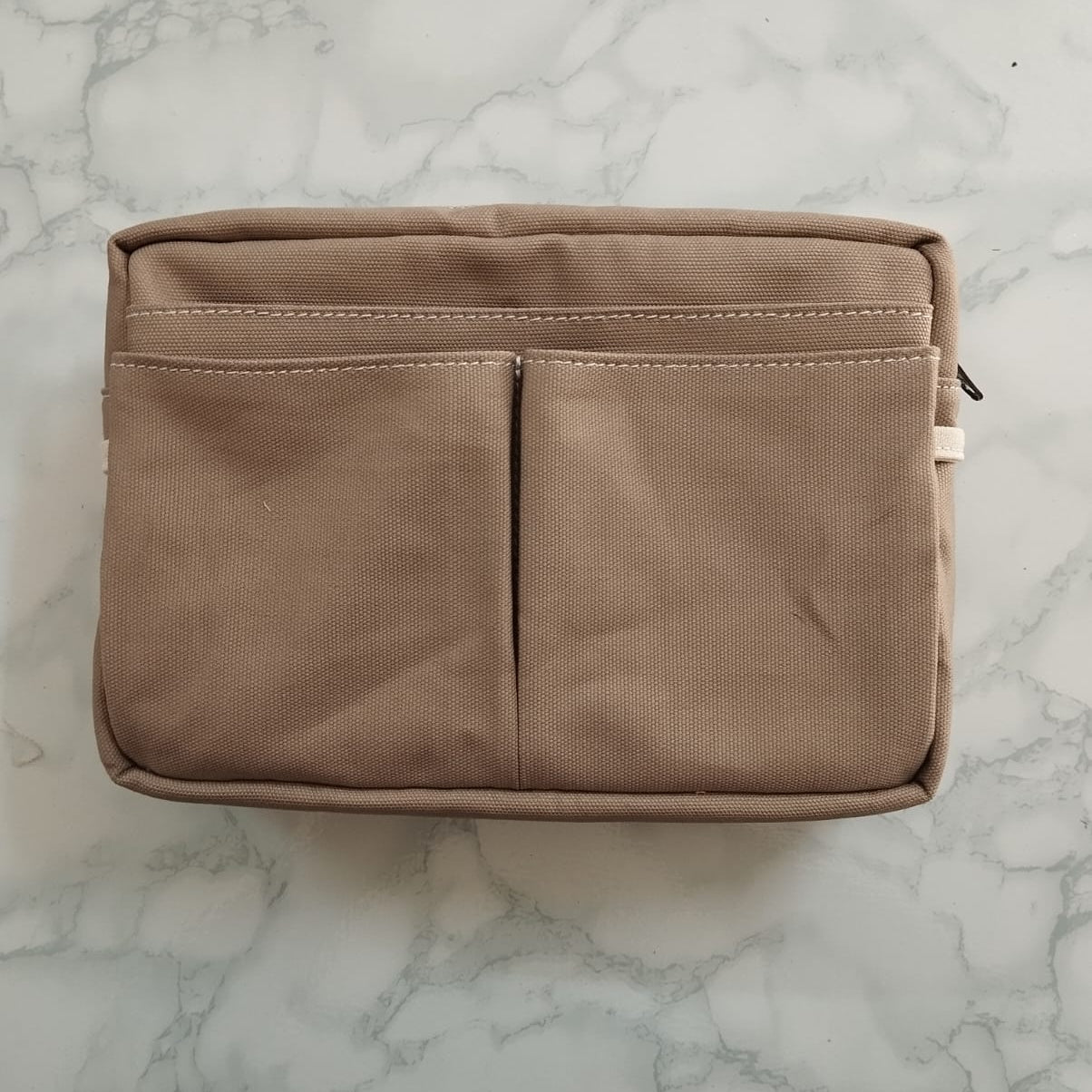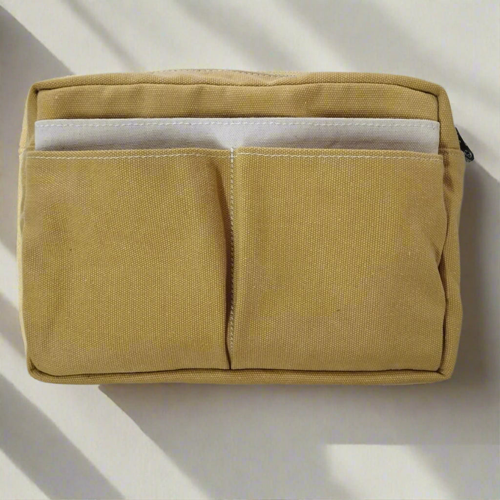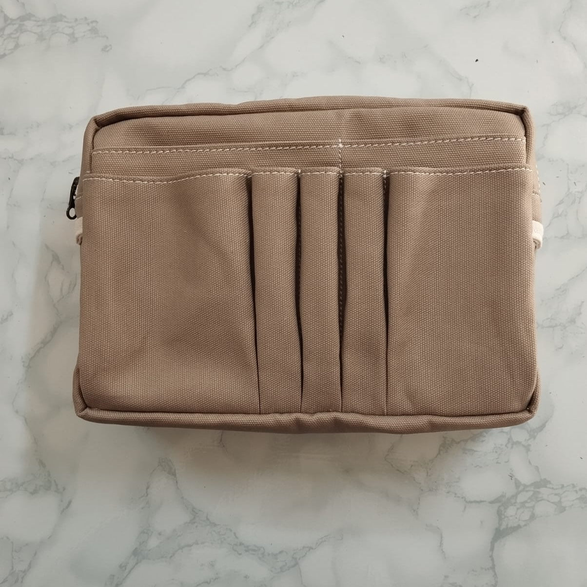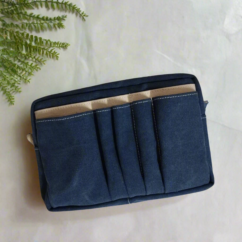 One full-width flat pocket topped with two additional box pleat pockets — ideal for quick-grab items like stickers, earbuds, or washi rolls. -