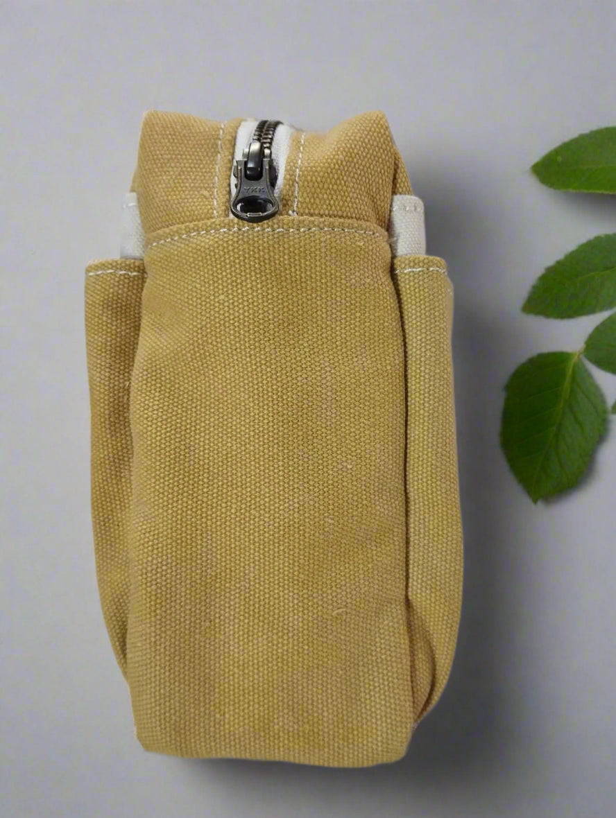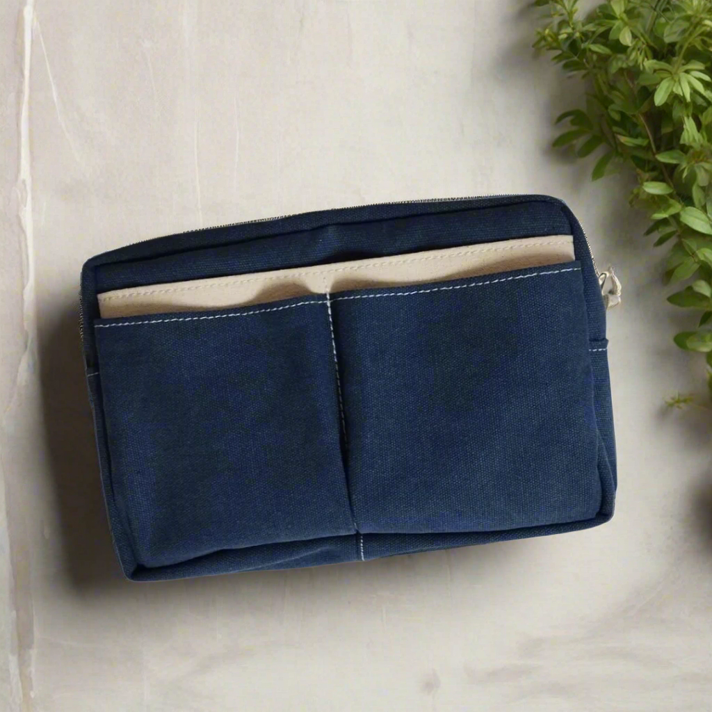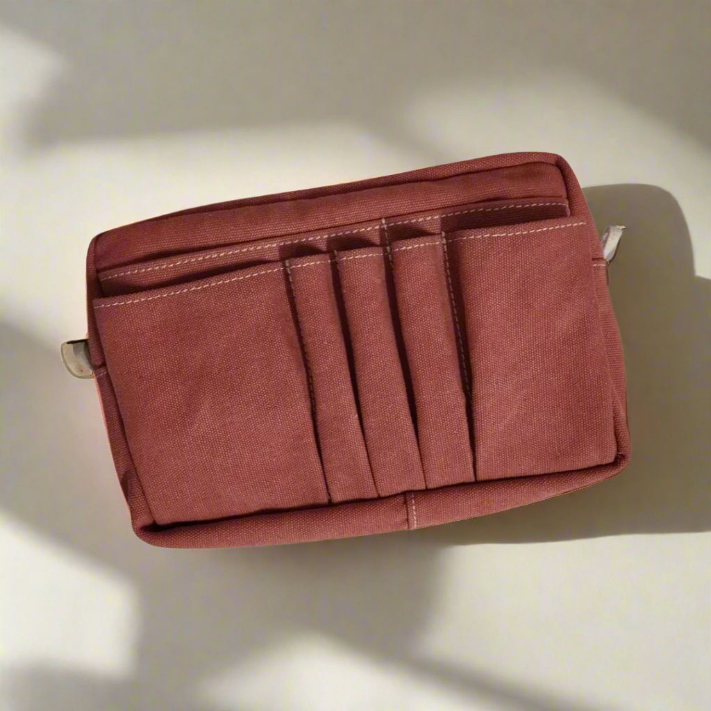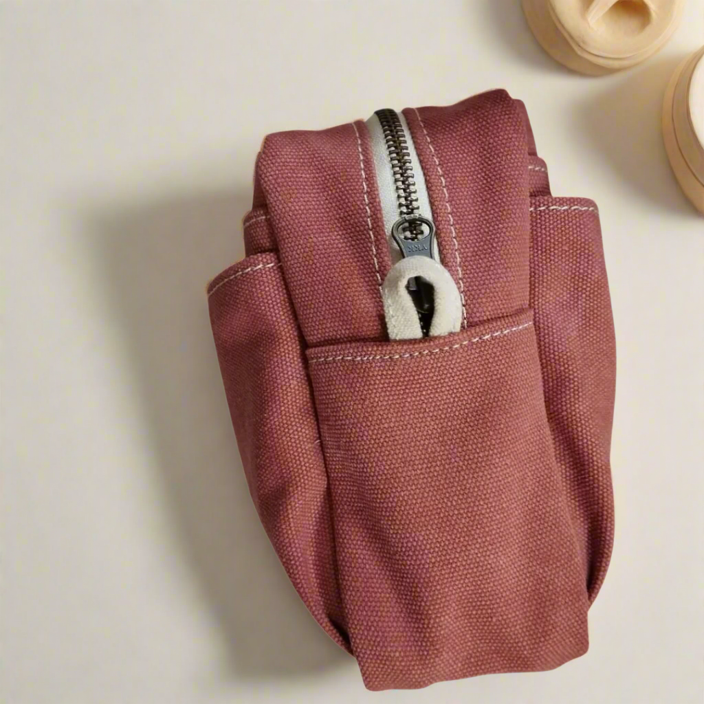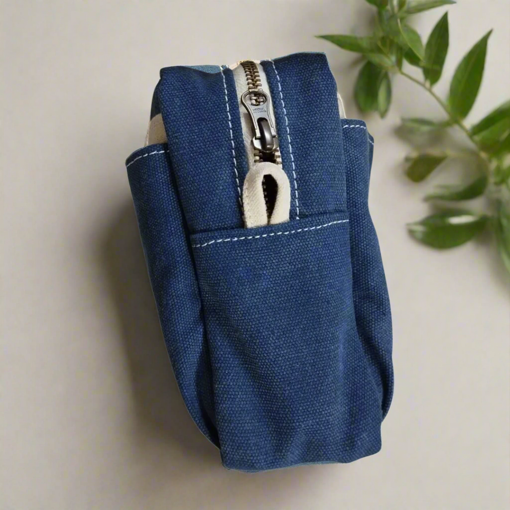 One full-width flat pocket topped with two additional box pleat pockets — ideal for quick-grab items like stickers, earbuds, or washi rolls. -