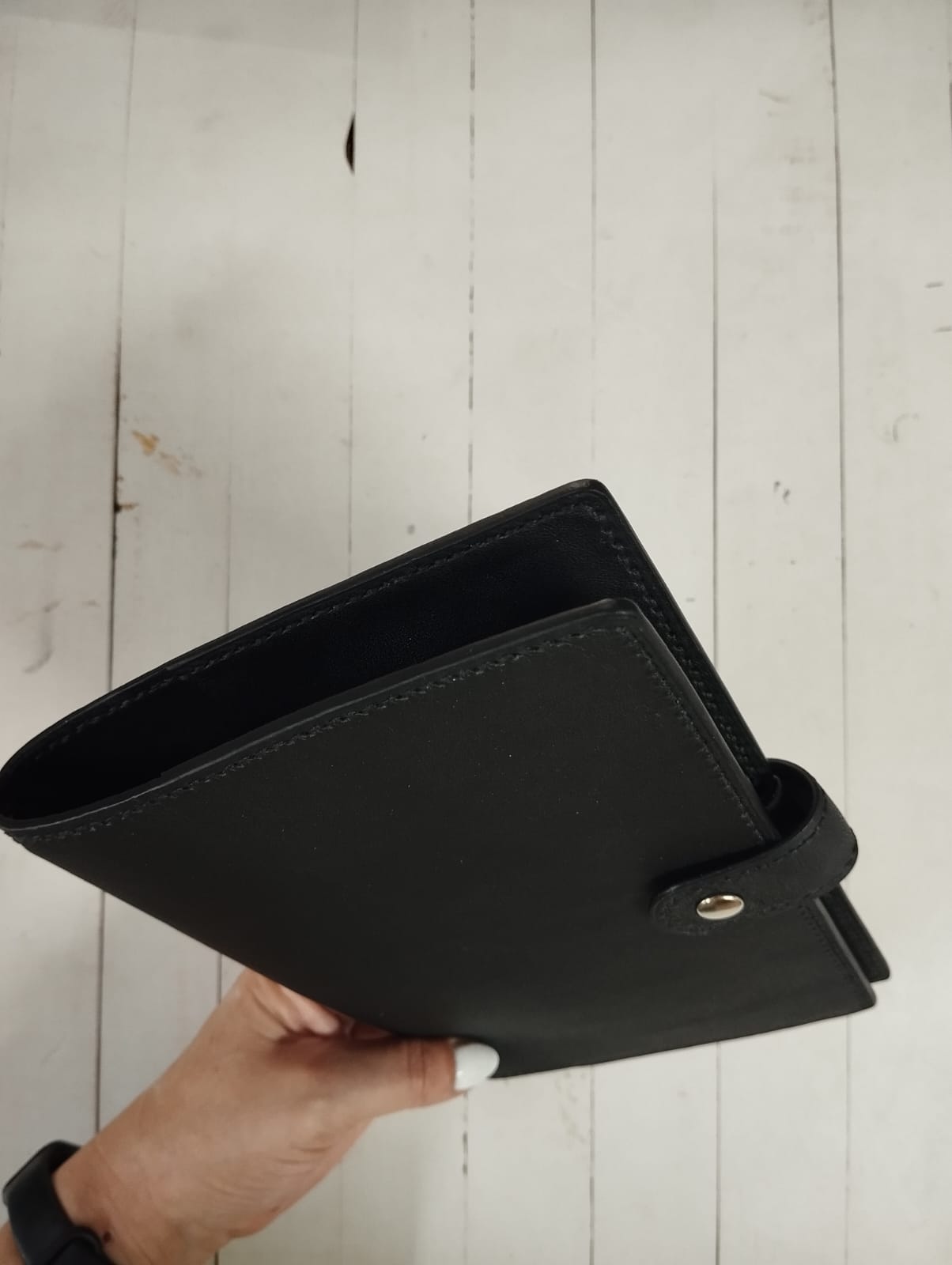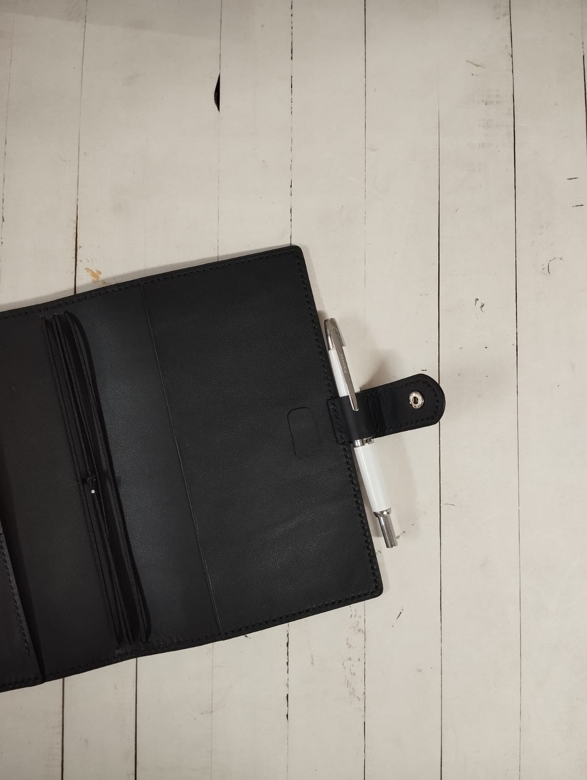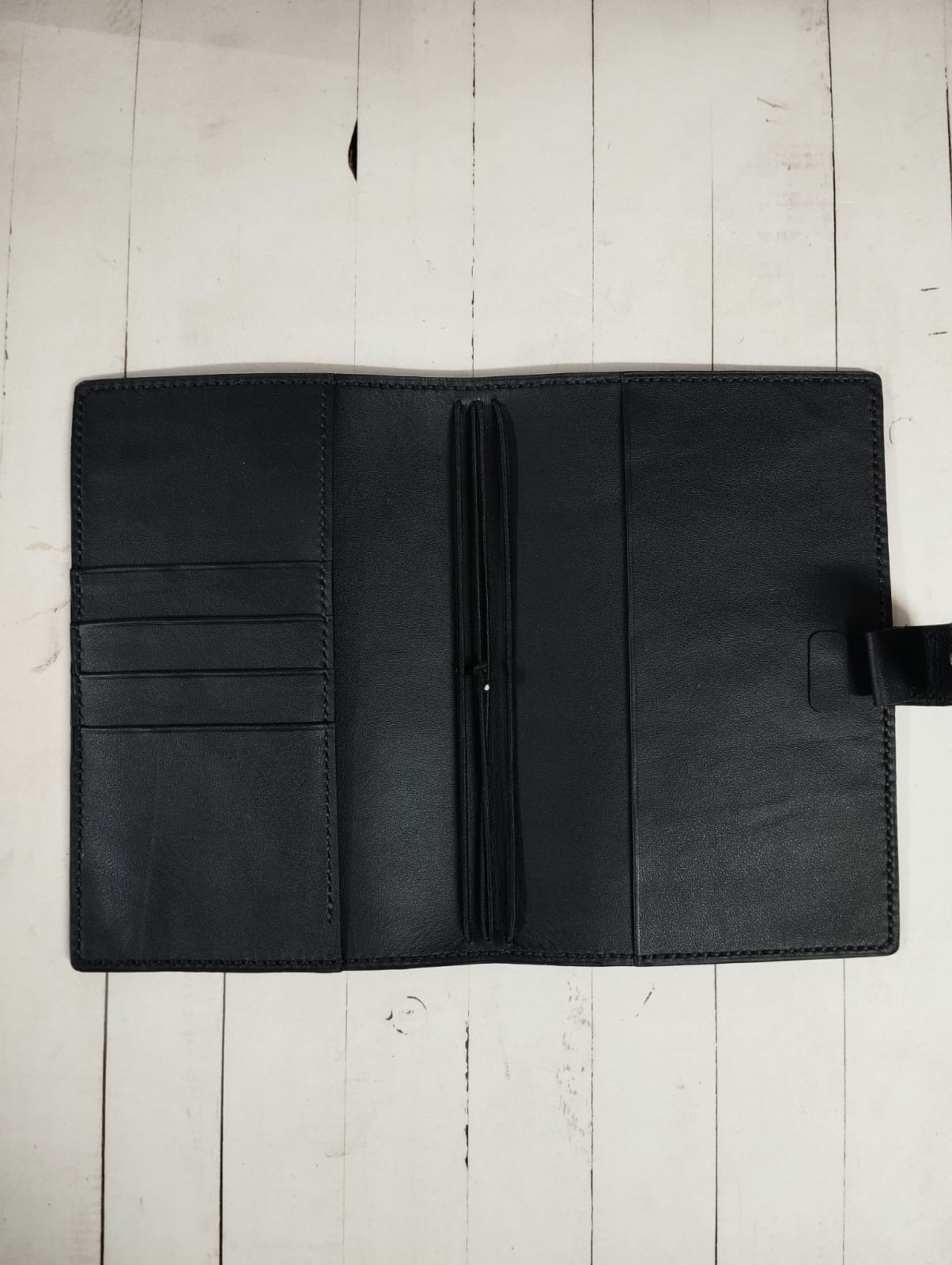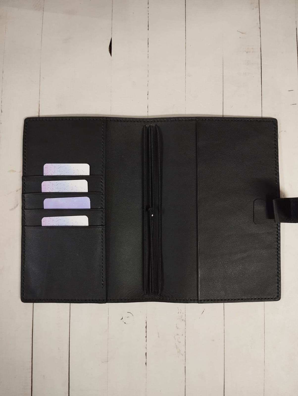 Inside, you’ll find thoughtfully designed storage: a full-length pocket up front, three to four roomy card slots, and a full-length back pocket—all crafted from the same supple, thin leather to keep things streamlined. The pockets are finished using the folded edge technique, adding an extra touch of refinement.